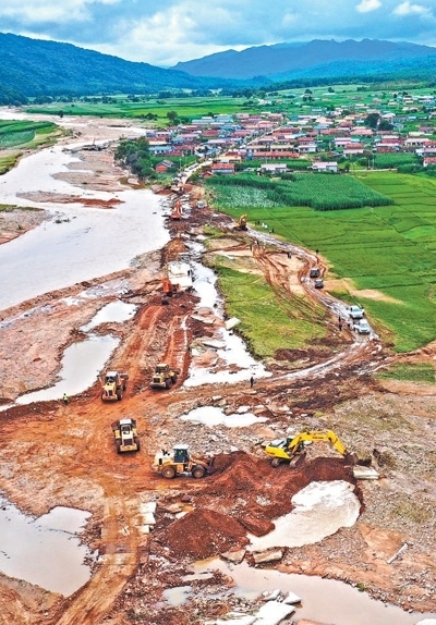 8月6日,在通往吉林省舒蘭市青松林場(chǎng)的村道上,大型機(jī)械在搶修水毀道路。劉以晴 閆 斌攝影報(bào)道