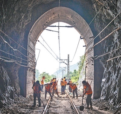 8月7日,北京市門(mén)頭溝區(qū)王平鎮(zhèn),中國(guó)鐵路北京局北京西工務(wù)段工作人員在清理路基和軌道。本報(bào)記者 張武軍攝