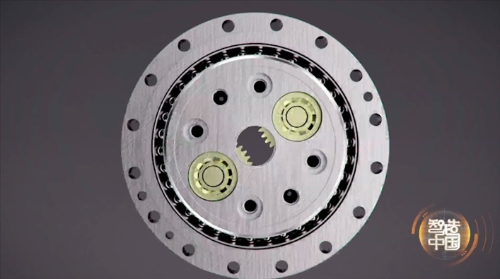 打開RV減速機(jī),里面就像一個(gè)太陽(yáng)系,既有太陽(yáng)輪,也有行星輪。這就是RV減速機(jī)的擺線行星輪,它們就像圍繞太陽(yáng)的行星,既有自轉(zhuǎn)也有公轉(zhuǎn),自轉(zhuǎn)一圈的同時(shí)公轉(zhuǎn)40圈,通過(guò)多組行星運(yùn)動(dòng)實(shí)現(xiàn)精密傳動(dòng),把電機(jī)的高速轉(zhuǎn)動(dòng)降下來(lái),同時(shí)增大轉(zhuǎn)矩,驅(qū)動(dòng)機(jī)器人手臂旋轉(zhuǎn)。