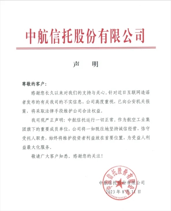 中航信托股份有限公司(下稱“中航信托”)在微信官方公眾號發(fā)文回應(yīng)稱,“針對近日互聯(lián)網(wǎng)造謠者發(fā)布的有關(guān)我司的不實信息,公司高度重視,已向公安機關(guān)報案,將采取法律手段維護公司合法權(quán)益。我司現(xiàn)嚴正聲明:中航信托運行一切正常。作為航空工業(yè)集團旗下的重要成員單位,公司將一如既往地堅持誠信經(jīng)營,恪守受托人職責,始終將維護投資者利益放在首要位置,為受益人利益最大化服務(wù)。”