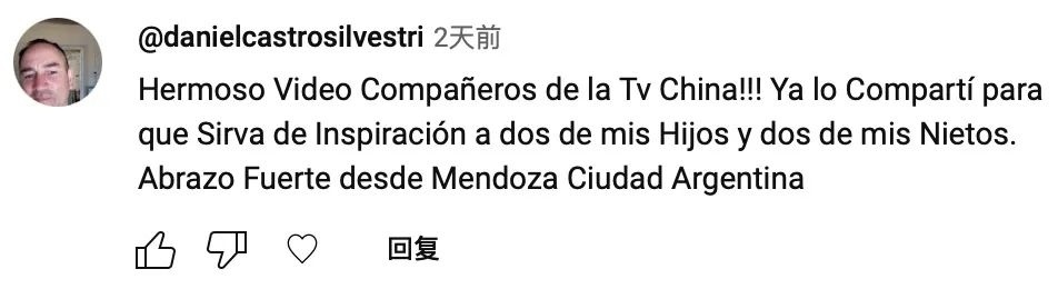 網(wǎng)友danielcastrosilvestri:“中國(guó)電視臺(tái)的朋友們,這個(gè)視頻太好看了?。。∥野阉窒沓鋈?,希望它能夠給我的兩個(gè)孩子和兩個(gè)孫子帶來(lái)啟發(fā)。我來(lái)自阿根廷的門多薩市,致禮?!?/p>