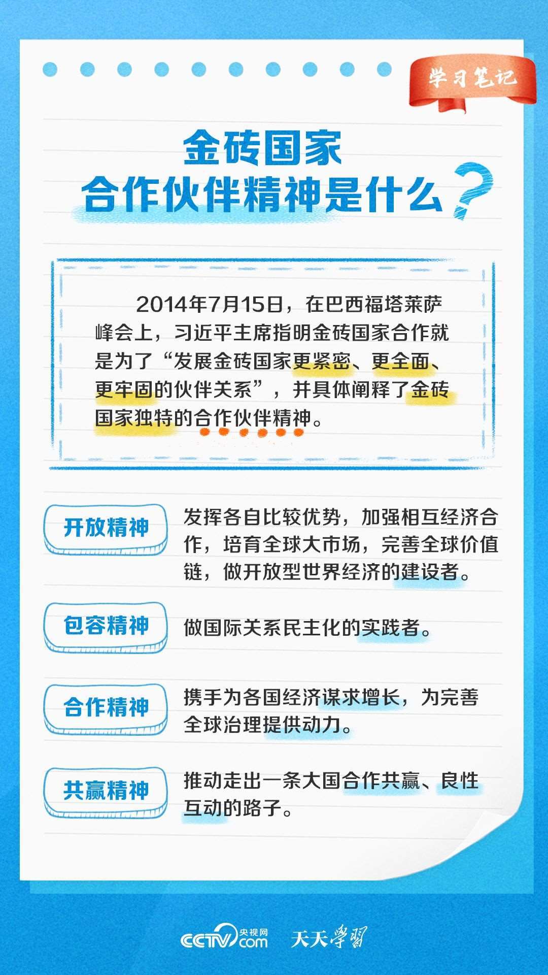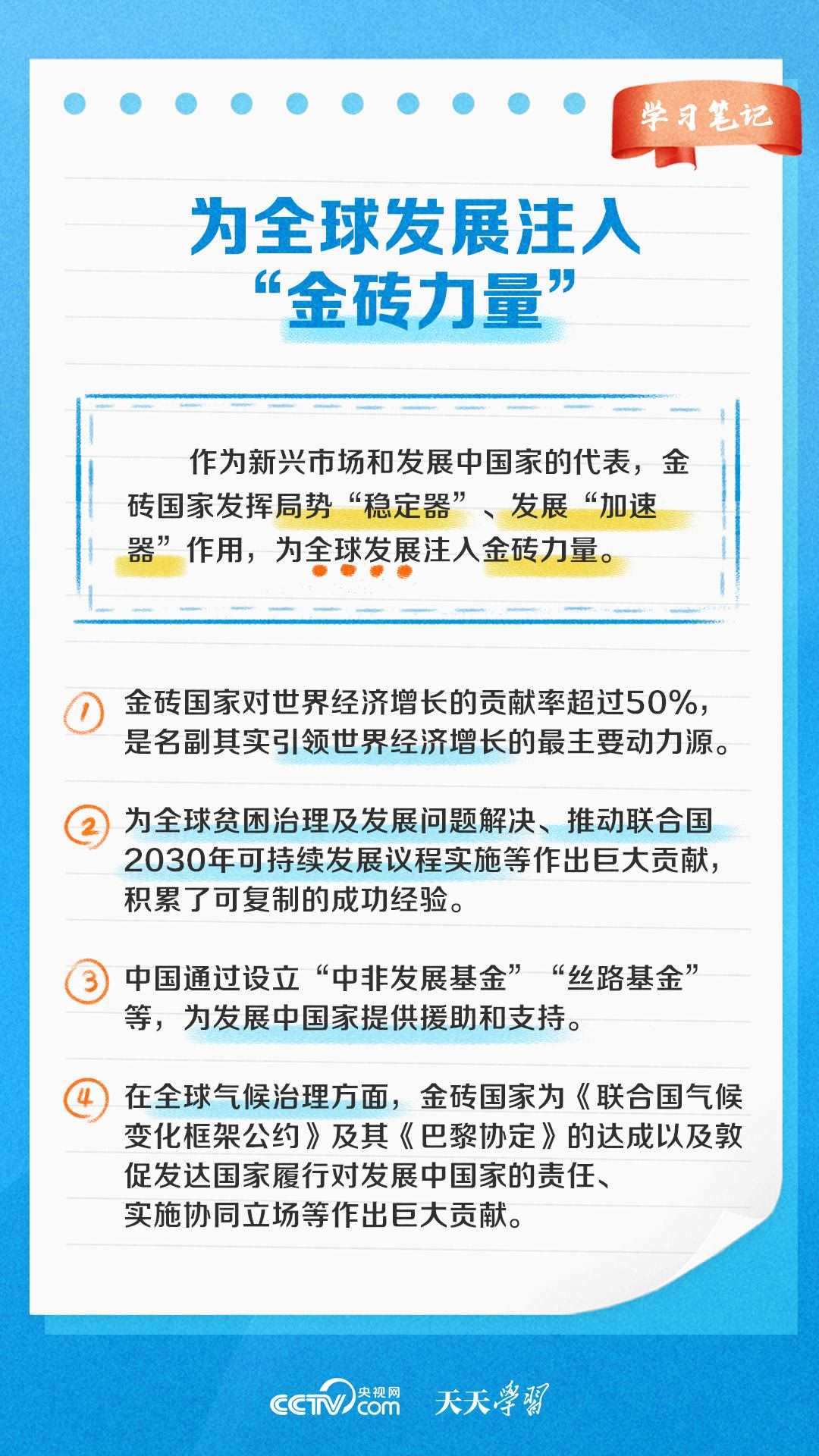 自金磚國(guó)家合作機(jī)制建立以來(lái),金磚國(guó)家合作不斷走深走實(shí),成為帶動(dòng)世界經(jīng)濟(jì)增長(zhǎng)、完善全球經(jīng)濟(jì)治理、推動(dòng)國(guó)際關(guān)系民主化的重要力量之一?!短焯鞂W(xué)習(xí)》特推出《學(xué)習(xí)筆記》,與您一起了解金磚國(guó)家合作機(jī)制緣何擁有強(qiáng)勁生命力。