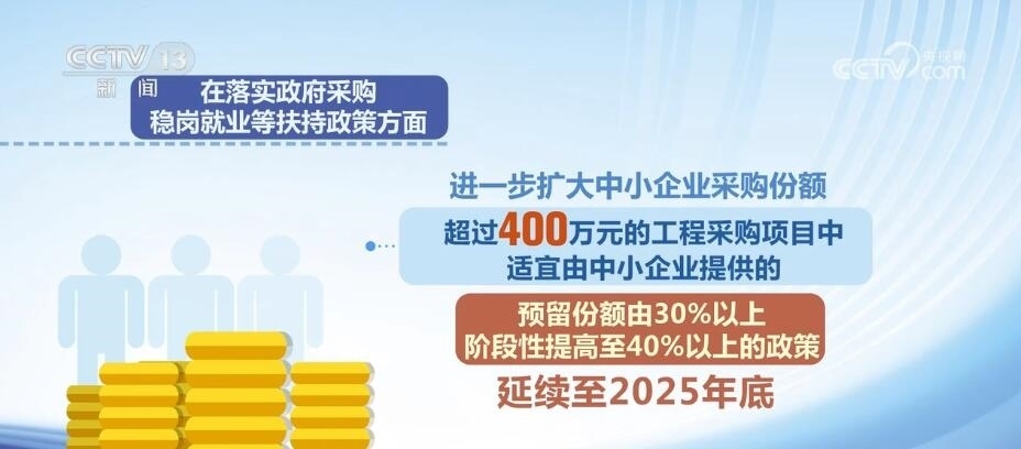 在落實(shí)政府采購、穩(wěn)崗就業(yè)等扶持政策方面,進(jìn)一步擴(kuò)大中小企業(yè)采購份額,超過400萬元的工程采購項(xiàng)目中適宜由中小企業(yè)提供的,預(yù)留份額由30%以上階段性提高至40%以上的政策延續(xù)至2025年底;中小微企業(yè)招用符合條件的畢業(yè)年度或離校2年內(nèi)未就業(yè)高校畢業(yè)生、登記失業(yè)青年,簽訂1年以上勞動(dòng)合同的,可按規(guī)定申請一次性吸納就業(yè)補(bǔ)貼;符合條件的中小微企業(yè)可按不超過企業(yè)及其職工上年度實(shí)際繳納失業(yè)保險(xiǎn)費(fèi)的60%申請失業(yè)保險(xiǎn)穩(wěn)崗返還;對招用畢業(yè)年度和離校2年內(nèi)未就業(yè)高校畢業(yè)生的小微企業(yè),按規(guī)定落實(shí)社會(huì)保險(xiǎn)補(bǔ)貼政策。