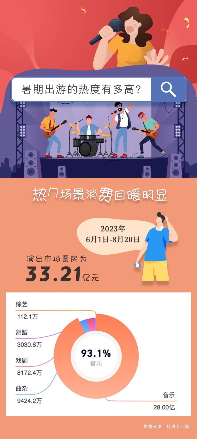 作為演出市場(chǎng)的傳統(tǒng)旺季,暑假期間演唱會(huì)、Live house、戲劇、音樂(lè)劇等各類熱門(mén)演出“一票難求”。根據(jù)燈塔專業(yè)版最新數(shù)據(jù),暑期檔中的6月1日至8月23日演出市場(chǎng)票房已經(jīng)超過(guò)30億元,而相當(dāng)可觀的跨城觀演比例,更引得除了演出票房之外的周邊產(chǎn)業(yè)一起火。“一個(gè)演出圈粉一座城”,當(dāng)?shù)芈糜谓?jīng)濟(jì)不斷涌現(xiàn)新的可能。