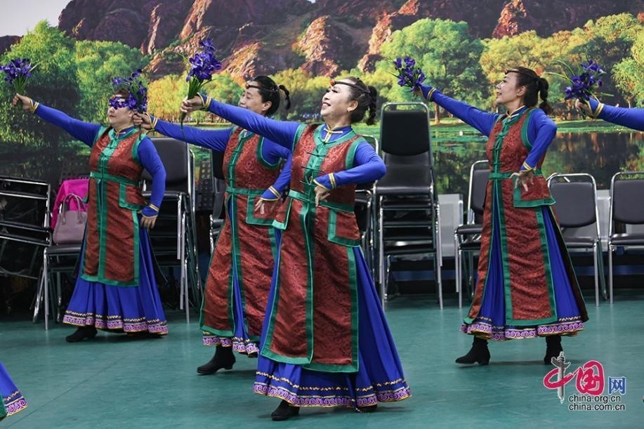 在臨潢家園社區(qū)便民服務(wù)中心內(nèi),由社區(qū)里各民族居民組成的烏蘭牧騎小分隊正在排練廳內(nèi)練習(xí)舞蹈。中國網(wǎng)記者 倫曉璇 攝