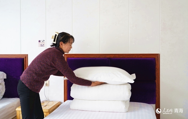 巴音村的民宿內(nèi),主人正在整理床鋪。人民網(wǎng)記者 楊啟紅攝