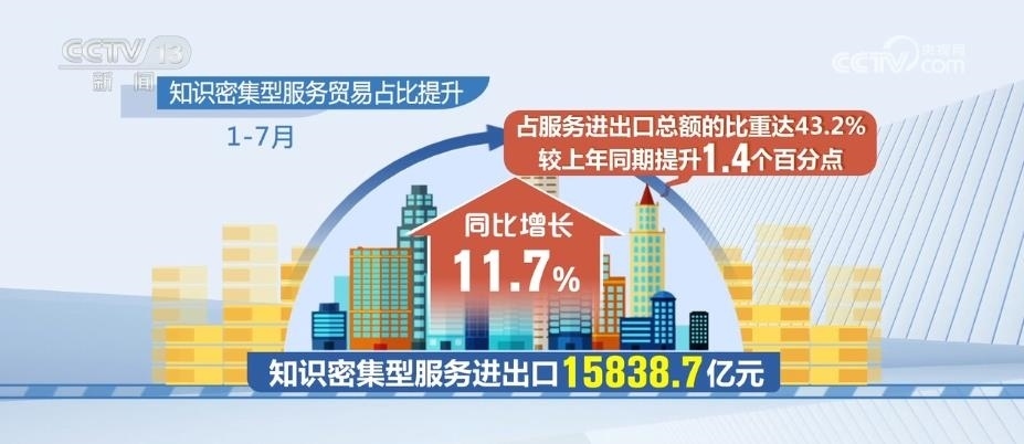 知識密集型服務(wù)貿(mào)易占比提升。1月—7月,知識密集型服務(wù)進(jìn)出口15838.7億元,同比增長11.7%,占服務(wù)進(jìn)出口總額的比重達(dá)43.2%,較上年同期提升1.4個(gè)百分點(diǎn)。