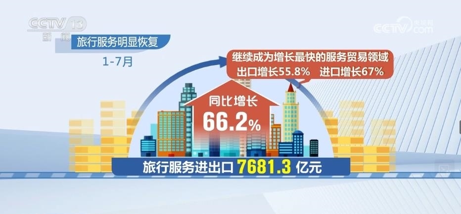 旅行服務(wù)明顯恢復(fù)。1月—7月,旅行服務(wù)進(jìn)出口7681.3億元,同比增長66.2%,繼續(xù)成為增長最快的服務(wù)貿(mào)易領(lǐng)域。其中,出口增長55.8%、進(jìn)口增長67%。