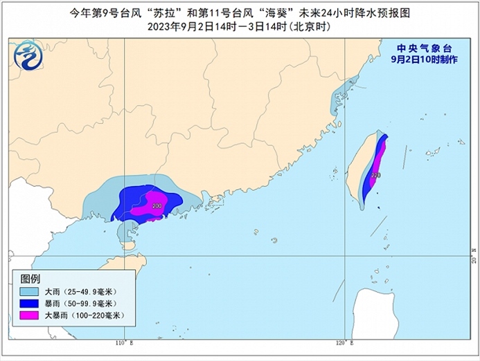 降水預(yù)報(bào):9月2日14時(shí)至3日14時(shí),受“蘇拉”和“??庇绊懀瑥V東西南部、廣西東南部、福建東北部沿海、臺(tái)灣島東部等地有大到暴雨,其中,廣東西南部、臺(tái)灣島東部等地部分地區(qū)有大暴雨(100~220毫米)。