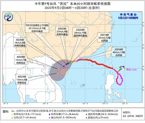 另外,今年第9號(hào)臺(tái)風(fēng)“蘇拉”的中心今天(9月2日)上午8點(diǎn)鐘位于廣東省臺(tái)山市近海,就是北緯21.6度、東經(jīng)112.7度,中心附近最大風(fēng)力有13級(jí)(40米/秒),中心最低氣壓為960百帕。