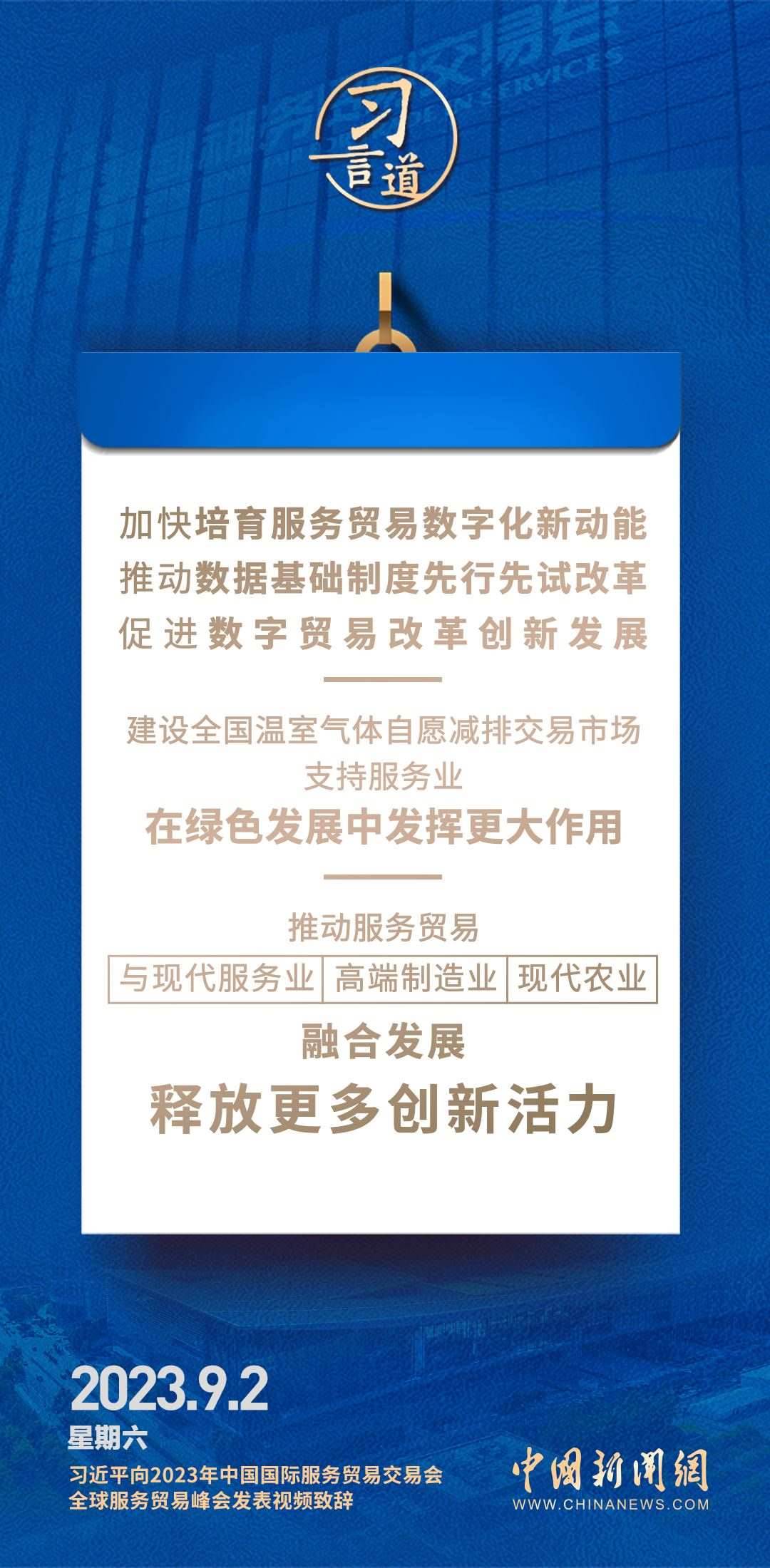 9月2日上午,國家主席習(xí)近平在北京向2023年中國國際服務(wù)貿(mào)易交易會(huì)全球服務(wù)貿(mào)易峰會(huì)發(fā)表視頻致辭。習(xí)近平指出——