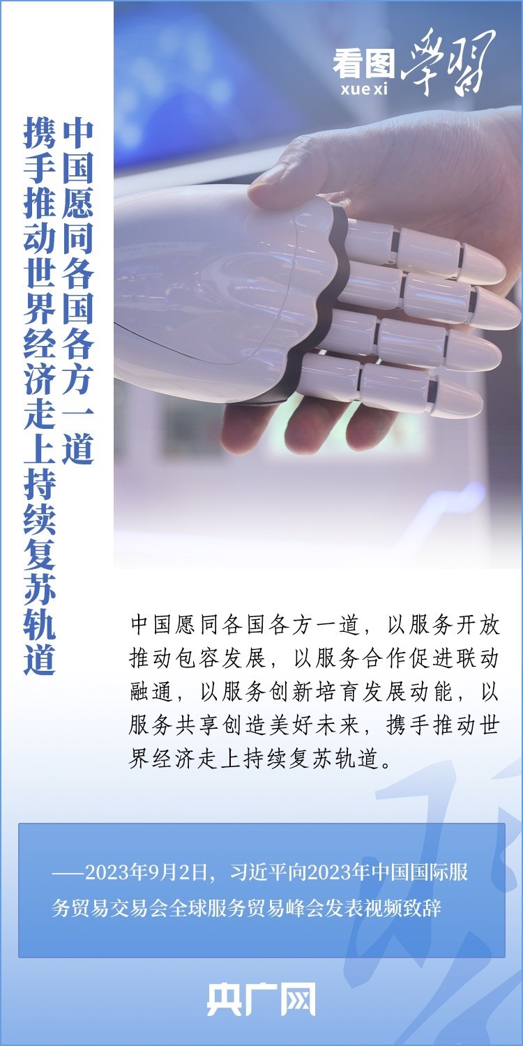 9月2日上午,以“開放引領發(fā)展 合作共贏未來”為主題的2023年中國國際服務貿易交易會在北京舉行。國家主席習近平向2023年中國國際服務貿易交易會全球服務貿易峰會發(fā)表視頻致辭表示,中國愿同各國各方一道,攜手推動世界經濟走上持續(xù)復蘇軌道。一起來學習!