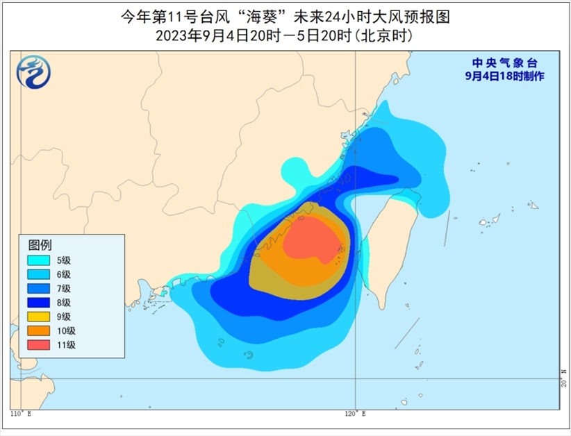 大風預(yù)報:9月4日20時至5日20時,臺灣海峽、東海西南部、南海東北部以及福建沿海、廣東中東部沿海、臺灣島西部和北部沿海將有6-8級、陣風9-10級大風,部分海域或地區(qū)的風力有9-11級,陣風12-13級。