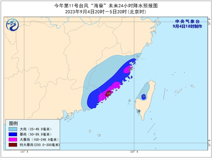 降水預(yù)報:9月4日20時至5日20時,福建大部、廣東東部、江西東南部、浙江東南部、臺灣島西部等地部分地區(qū)有大到暴雨,其中,福建東部、廣東東南部等地部分地區(qū)有大暴雨,局地特大暴雨(250-300毫米)。上述部分地區(qū)伴有短時強降水(最大小時降雨量30-50毫米,局地可超過70毫米),局地有雷暴大風等強對流天氣。