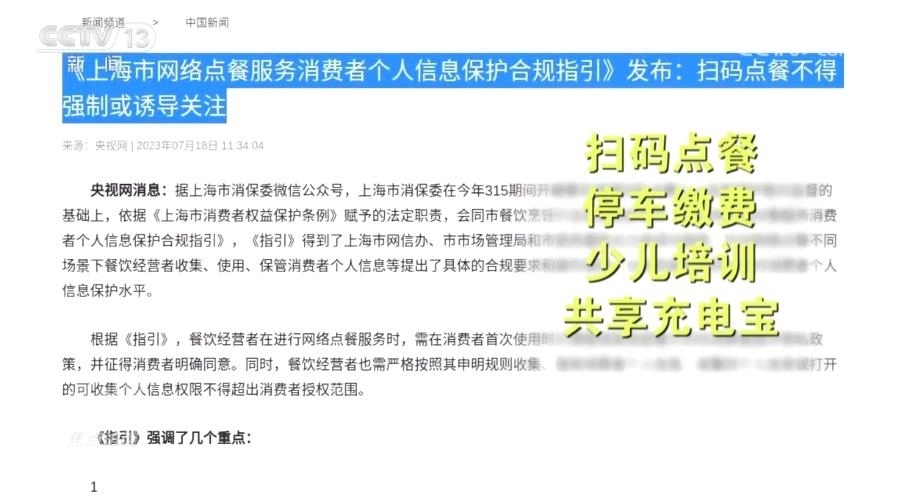 為了加強個人信息保護,上海市消保委自7月起針對掃碼點餐、停車繳費、少兒培訓和共享充電寶等四種消費場景,分別出臺了合規(guī)指引、自律承諾和合規(guī)清單。未來,還將針對房產(chǎn)中介、商超購物等主要消費場景作出相應(yīng)指引。