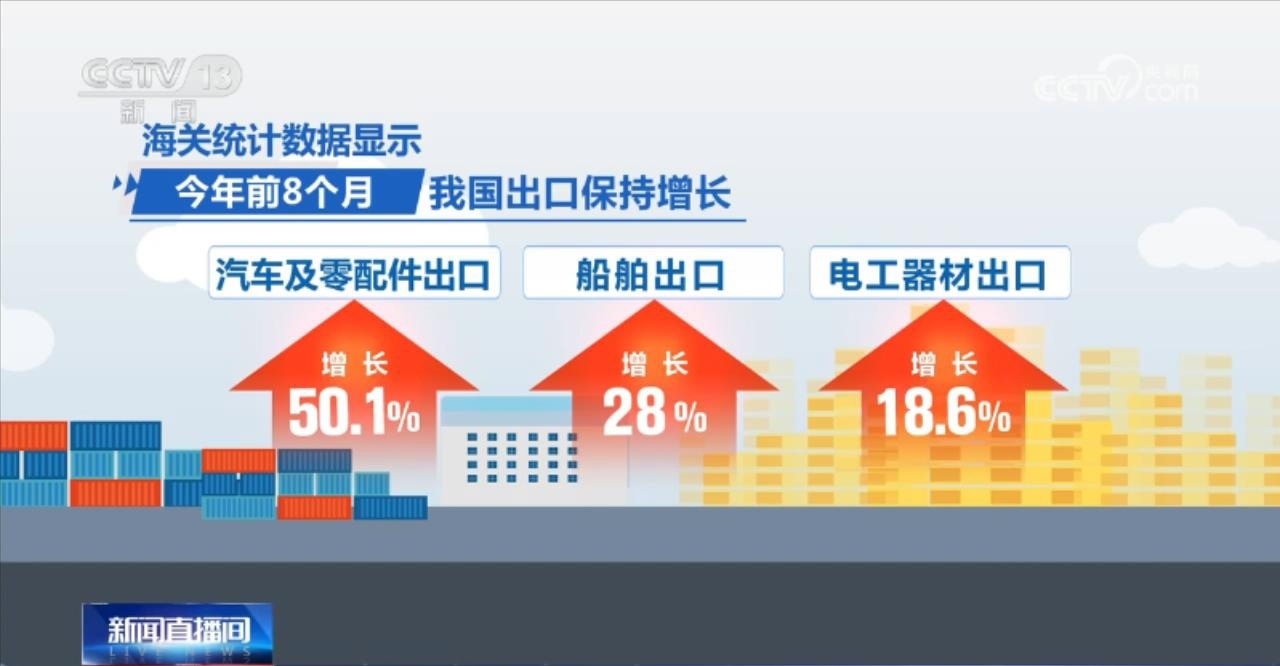 今年前8個(gè)月,我國(guó)出口保持增長(zhǎng)。其中,機(jī)電產(chǎn)品出口8.97萬(wàn)億元,同比增長(zhǎng)3.6%,占同期我國(guó)出口總值的58%;汽車(chē)及零配件出口、船舶出口、電工器材出口分別增長(zhǎng)50.1%、28%、18.6%。