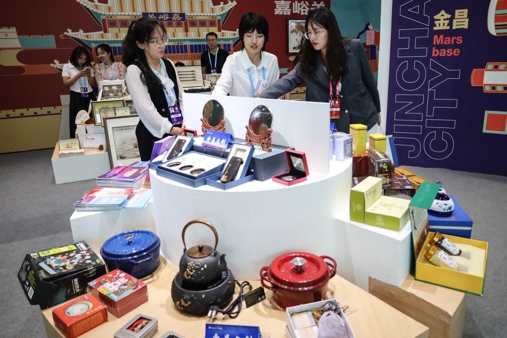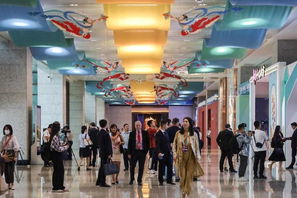 9月6日,與會(huì)嘉賓在第六屆絲綢之路(敦煌)國(guó)際文化博覽會(huì)上參觀文創(chuàng)產(chǎn)品和文旅裝備展銷活動(dòng)。新華社記者 馬希平 攝