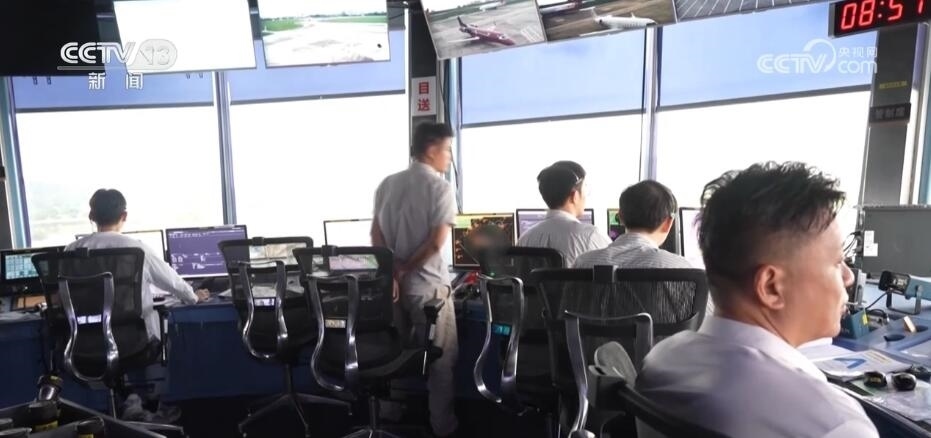 這里就是控制整個機(jī)場航班的“中樞”所在——空管塔臺,伴隨著一句句簡短的指令發(fā)出,一架架滿載著旅客的客機(jī)有序起降。管制員們一邊緊盯電腦雷達(dá)顯示器,一邊查看機(jī)場跑道情況,指揮調(diào)控飛機(jī)的飛行線路和高度。