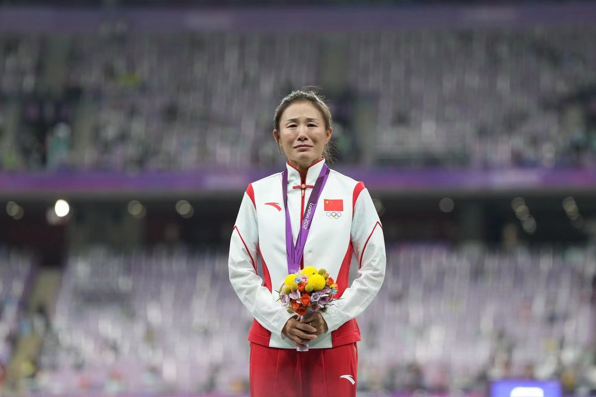 補發(fā)現場,首先頒發(fā)的是男子4×100米接力銅牌。四位中國小伙子笑著走上銅牌領獎臺,接受頒獎。隨后的競走頒獎儀式上,在三位得獎運動員獲頒獎牌后,《義勇軍進行曲》奏響,三面五星紅旗冉冉升起,切陽什姐眼中涌動著晶瑩的淚花。