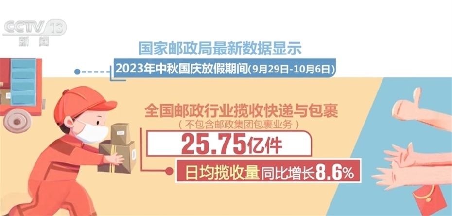 國(guó)家郵政局最新數(shù)據(jù)顯示,今年中秋國(guó)慶放假期間,全國(guó)郵政行業(yè)攬收快遞與包裹25.75億件,日均攬收量同比增長(zhǎng)8.6%;投遞快遞與包裹25.72億件,日均投遞量同比增長(zhǎng)18.7%。