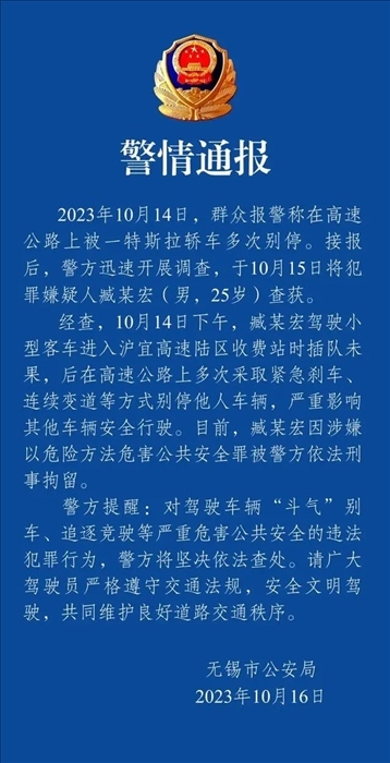 ·特斯拉插隊(duì)未果多次在高速上逼停同一車輛,無錫警方:司機(jī)涉嫌危害公共安全罪,刑拘!