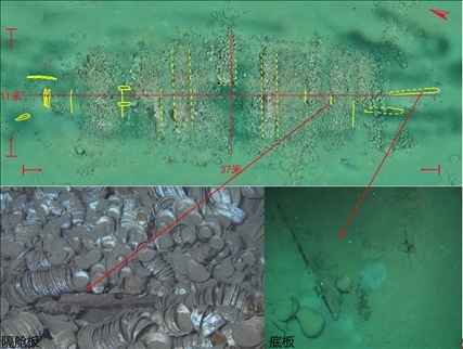 沉船遺址水深約30米,主體區(qū)域殘存有木質船體和成摞擺放的船貨堆積,范圍約300平方米??脊虐l(fā)掘發(fā)現(xiàn),沉船船體殘長約16.95米,最寬處保存約4.5米,殘存9道隔艙板和10個船艙,單層板結構,發(fā)現(xiàn)桅座、龍骨板、龍骨補強材以及舭龍骨等船體構件。