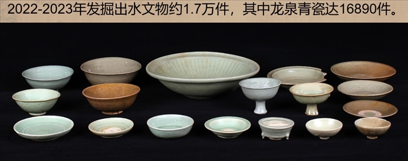 發(fā)掘出水文物標本約1.7萬件,主要為龍泉青瓷和陶罐、鉛錘、印章等船上生活、航海相關文物。其中龍泉青瓷數(shù)量達到1.6萬余件,器形包括碗、盤、碟、盞、洗、缽、香爐和高足杯等,年代為元代晚期,為典型的外銷貿易瓷。結合溫州朔門古港的考古發(fā)現(xiàn),推測該沉船可能是從溫州港出海前往東南亞的民間貿易商船。