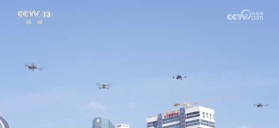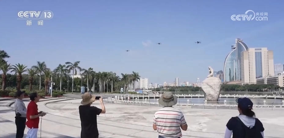 在廈門的白鷺洲上,四架無人機在空中列隊一字排開。