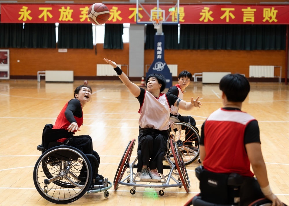 這是2023年8月31日,黃曉連(左二)在中國殘疾人體育運動管理中心訓練。新華社記者 才揚 攝