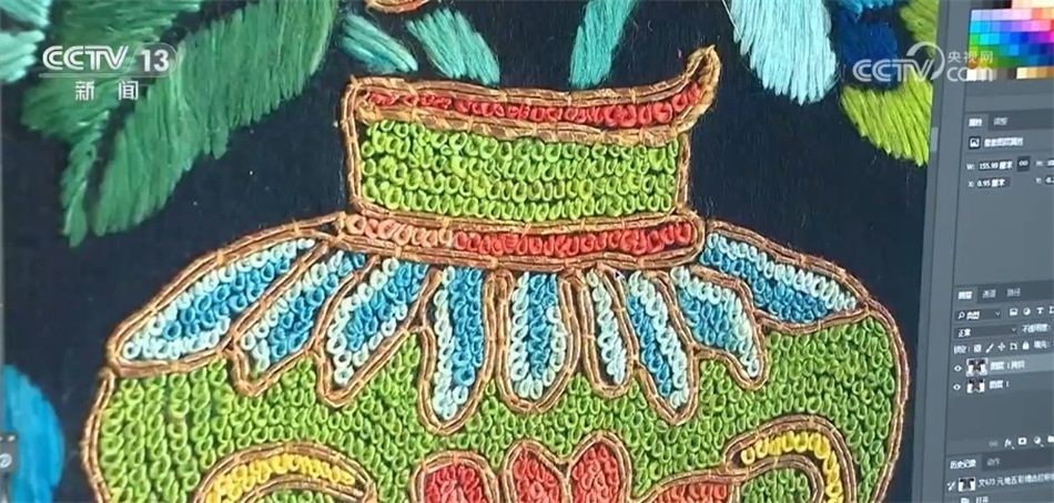 經(jīng)由高清設(shè)備采集、原樣分析、線圖提取,絲綢紋樣的圖案、色彩、針法、層級(jí)都在電腦屏幕上一覽無遺。