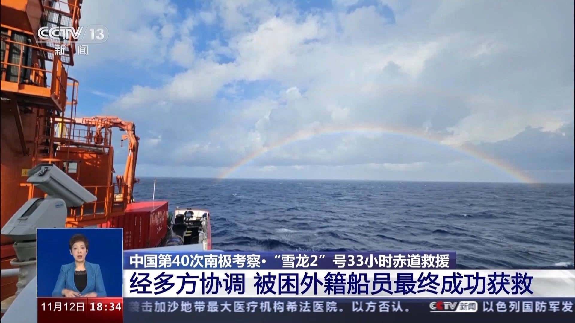 一個小時后,求救船只安全吊運(yùn)到“雪龍2”號的尾部甲板,此時,原本陰雨的天空放晴,一道彩虹掛在天邊,“雪龍2”號重新起航。