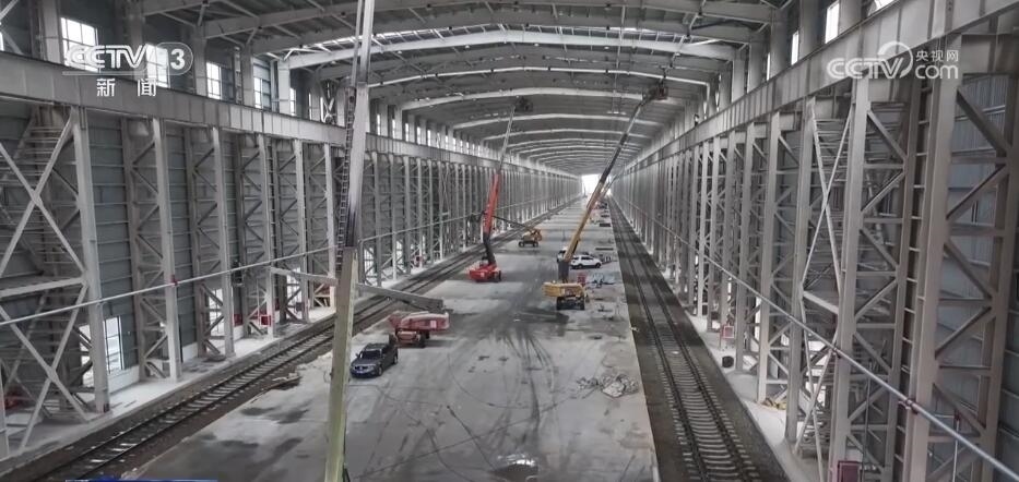 中鐵一局阿拉山口室內(nèi)集裝箱換裝庫項(xiàng)目副經(jīng)理 張剛:新庫要比老庫(寬)11.5米,這個堆放面積更大,兩個準(zhǔn)軌、寬軌分開以后,能夠?qū)崿F(xiàn)整列換裝。而且(除了)采用橋吊方式來換裝以外,還可以采用正面吊方式進(jìn)行換裝,換裝效率大概提高50%左右。