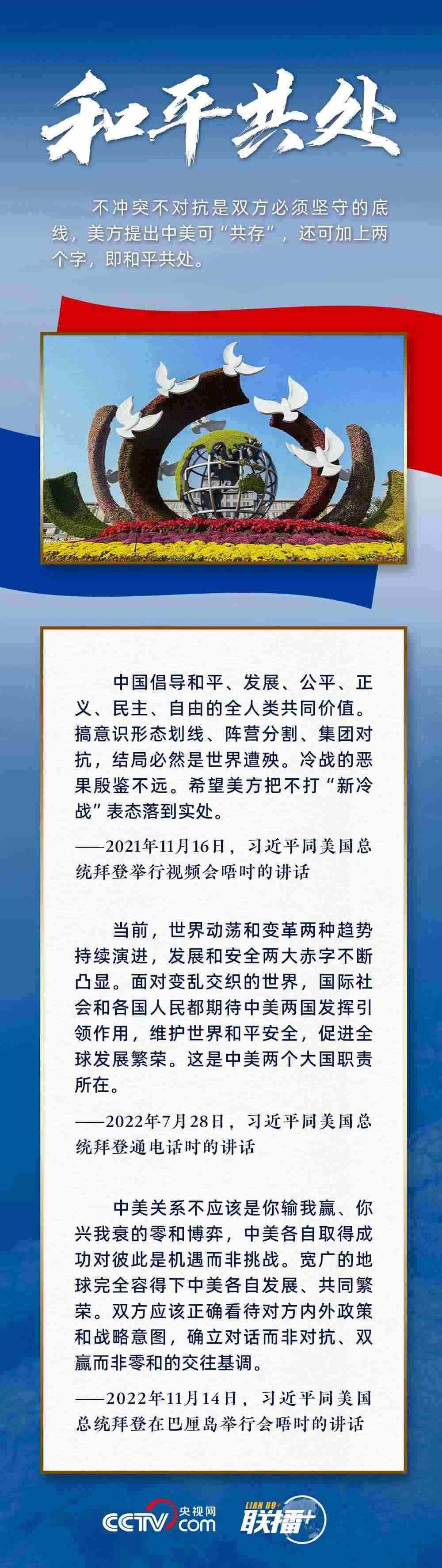 “中美不沖突、不對抗、和平共處,這是兩國最基本的共同利益?!绷?xí)主席指出,遵守國際關(guān)系基本準則和中美三個聯(lián)合公報,這是雙方管控矛盾分歧、防止對抗沖突的關(guān)鍵,也是中美關(guān)系最重要的防護和安全網(wǎng)。