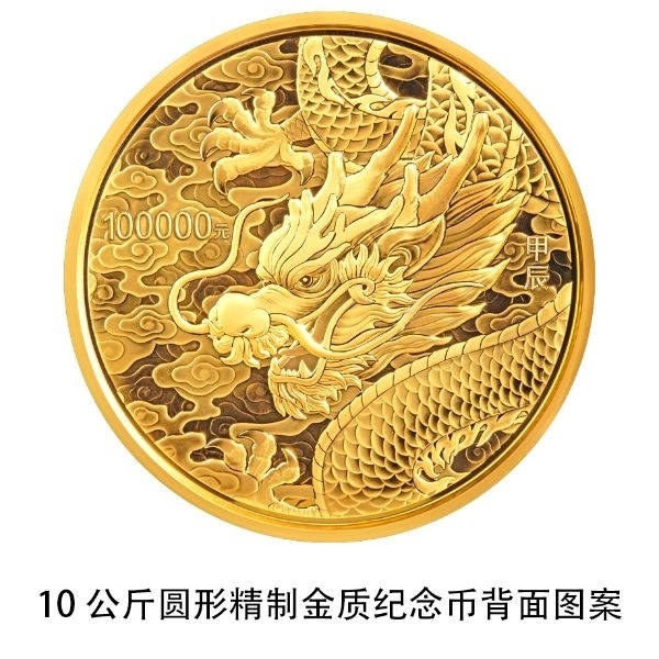10公斤圓形金質(zhì)紀(jì)念幣背面圖案為龍?jiān)煨停r以祥云組合設(shè)計(jì)。