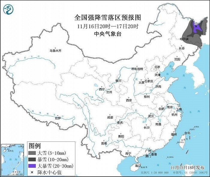 其中,11月15日20時至16日20時,黑龍江中部、吉林東部等地部分地區(qū)有大雪,黑龍江中部局地有暴雪(10~12毫米),上述部分地區(qū)新增積雪深度3~5厘米,局地可達7厘米以上。16日20時至17日20時,黑龍江中東部、吉林東北部等地部分地區(qū)有大雪,黑龍江東部部分地區(qū)有暴雪,局地大暴雪(20~25毫米),上述部分地區(qū)新增積雪深度5~10厘米,局地可達15厘米。
