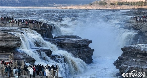 2023年11月14日,初冬時(shí)節(jié),陜西延安,游人在黃河壺口瀑布陜西側(cè)游覽觀瀑。