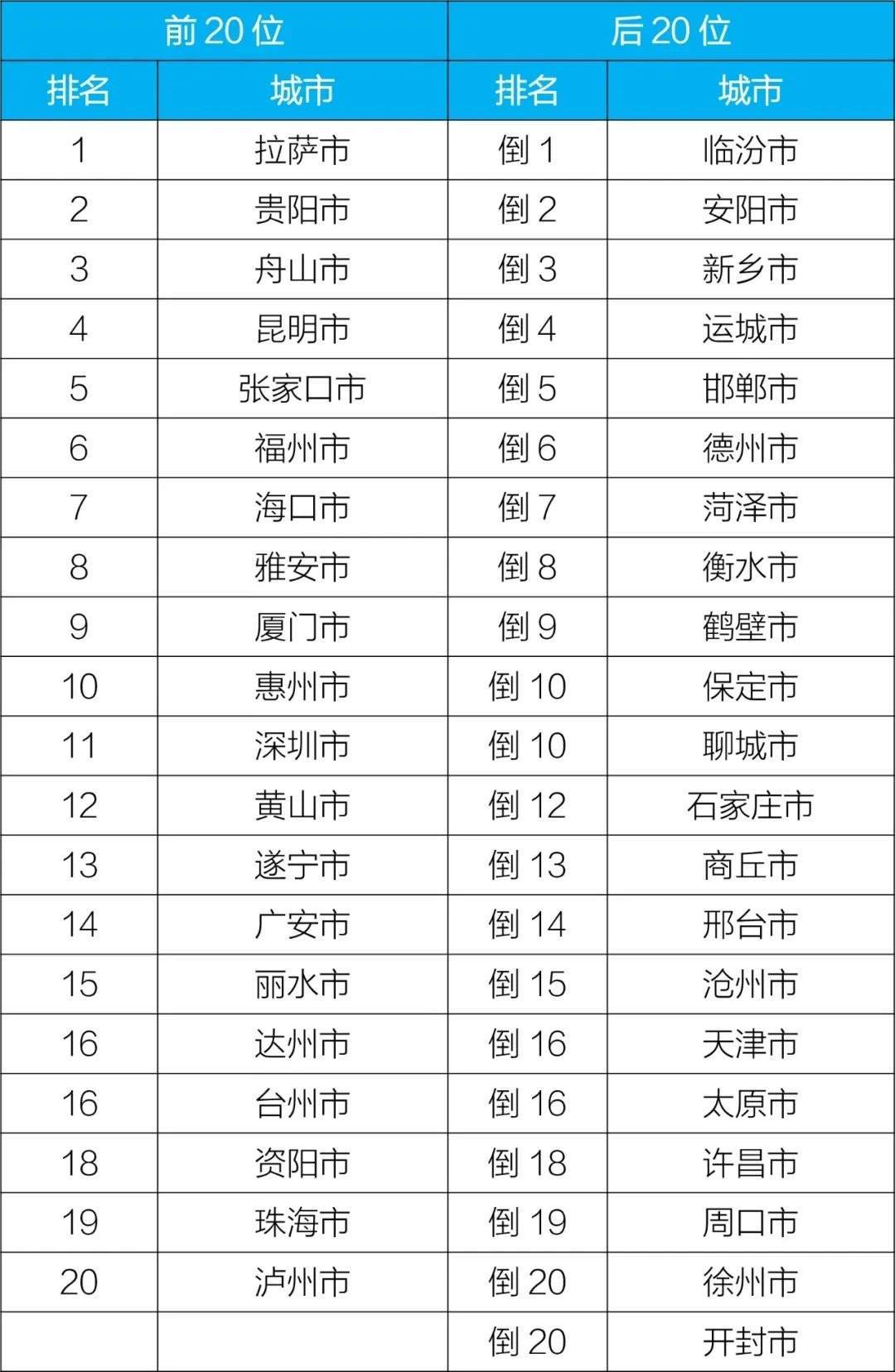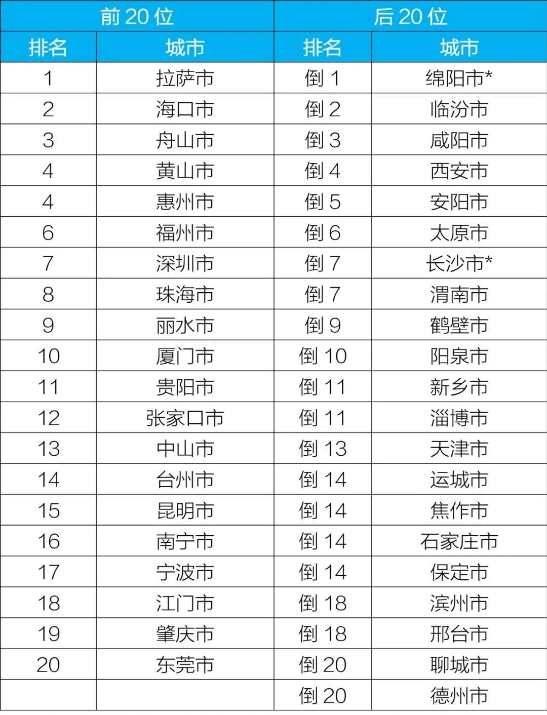 10月,168個(gè)重點(diǎn)城市中,空氣質(zhì)量排名前20位城市依次是拉薩、貴陽和舟山等城市(從第1名至第20名);空氣質(zhì)量排名后20位城市依次是臨汾、安陽和新鄉(xiāng)等城市(從倒數(shù)第1名至并列倒數(shù)第20名)。見附表1。