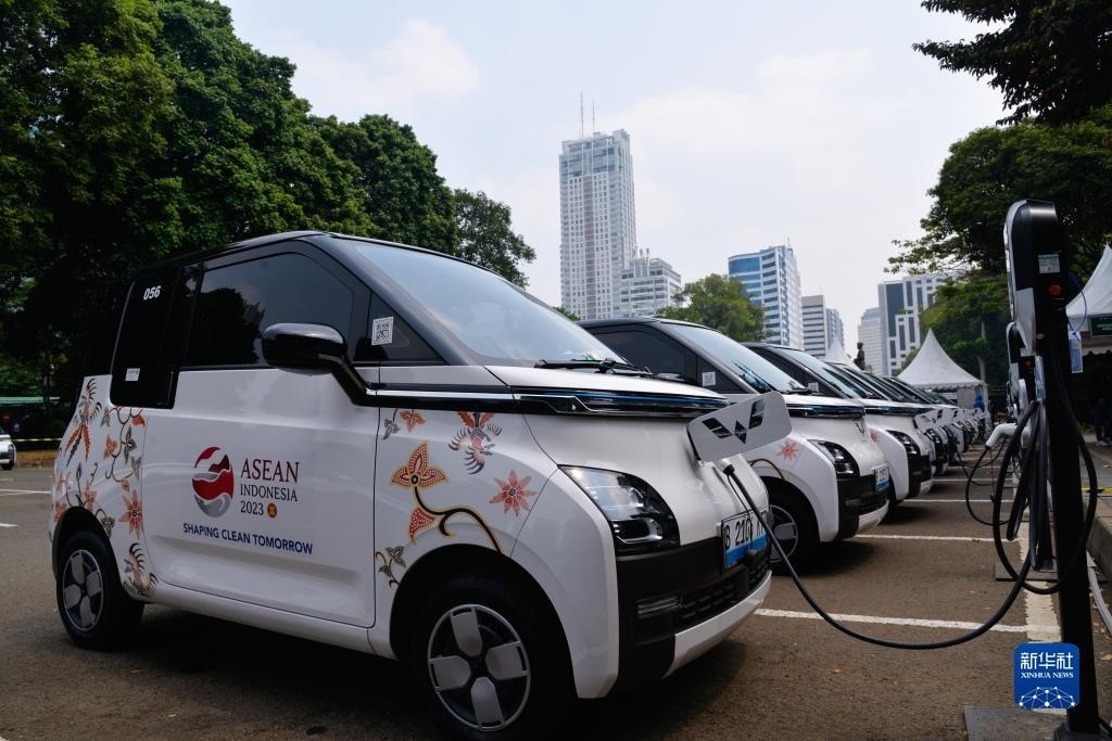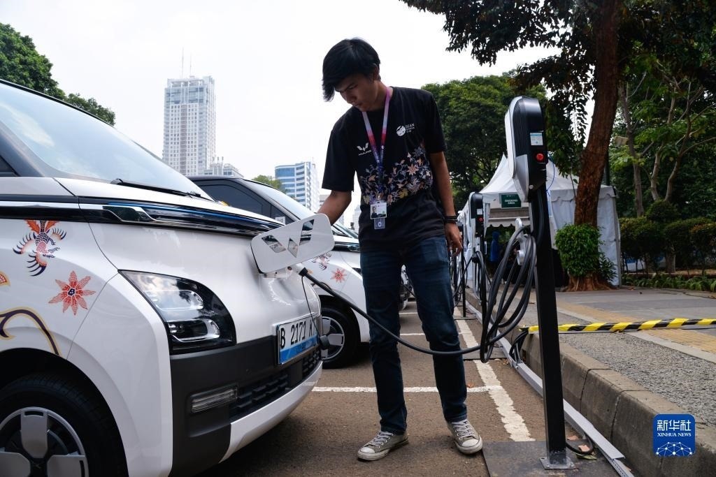9月6日,在印度尼西亞雅加達(dá)第43屆東盟峰會(huì)五菱汽車服務(wù)站,工作人員為一輛五菱新能源車Air ev充電。新華社記者 徐欽 攝