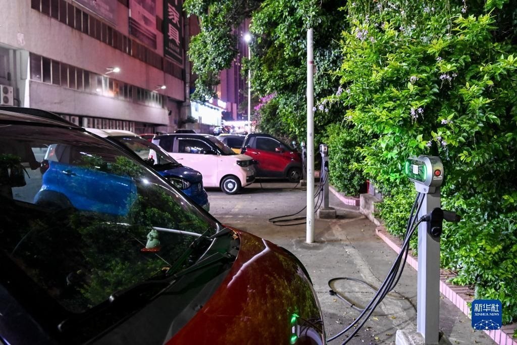 這是在廣西柳州市街頭拍攝的一處新能源汽車充電站(11月14日攝)。新華社記者 曹祎銘 攝