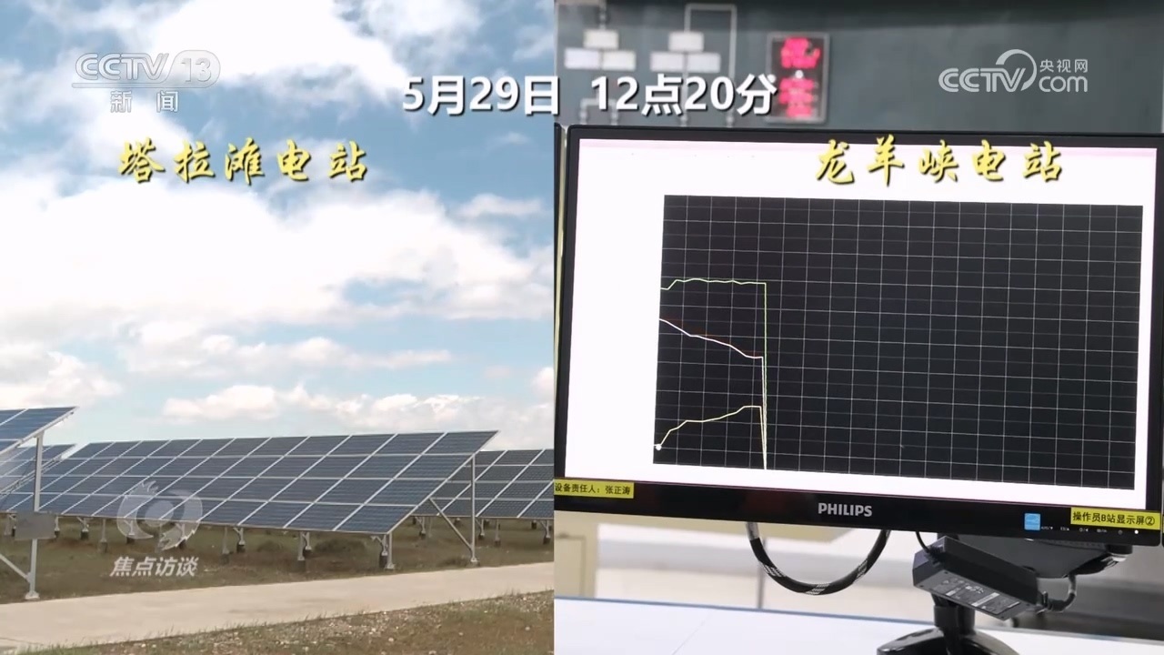 這一天,記者在龍羊峽水電站見到了水電光伏互補(bǔ)的實時情況。12點(diǎn)20分開始,50公里外塔拉灘光伏現(xiàn)場拍攝的影像顯示,有一大片云經(jīng)過光伏電站,光伏發(fā)電輸出立即發(fā)生了變化。這個數(shù)據(jù)變化實時傳到水電站的水光互補(bǔ)系統(tǒng)。