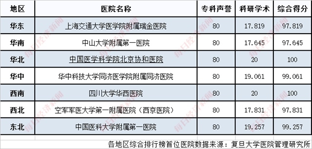 分地區(qū)看,中國(guó)醫(yī)學(xué)科學(xué)院北京協(xié)和醫(yī)院和四川大學(xué)華西醫(yī)院分別以??坡曌u(yù)(80)、科研學(xué)術(shù)(20)雙滿分的成績(jī)領(lǐng)跑華北地區(qū)、西南地區(qū)的綜合排行榜,中國(guó)醫(yī)科大學(xué)附屬第一醫(yī)院和華中科技大學(xué)同濟(jì)醫(yī)學(xué)院附屬同濟(jì)醫(yī)院則分別以99.257和99.061的成績(jī)領(lǐng)跑東北地區(qū)和華中地區(qū)。此外,上海交通大學(xué)醫(yī)學(xué)院附屬瑞金醫(yī)院、中山大學(xué)附屬第一醫(yī)院、空軍軍醫(yī)大學(xué)第一附屬醫(yī)院(西京醫(yī)院)也分別在各地區(qū)的綜合排行榜中位列首位。