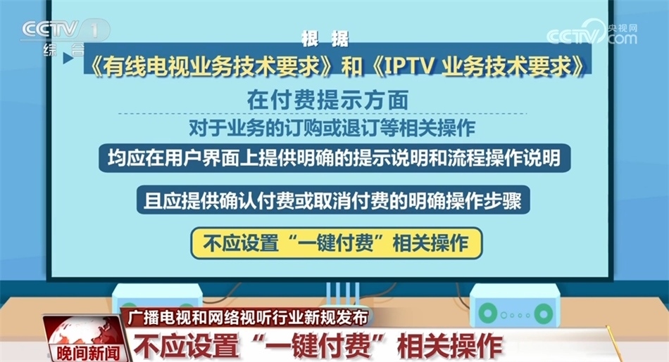 在付費提示方面,對于業(yè)務(wù)的訂購或退訂等相關(guān)操作,均應(yīng)在用戶界面上提供明確的提示說明和流程操作說明,且應(yīng)提供確認(rèn)付費或取消付費的明確操作步驟,不應(yīng)設(shè)置“一鍵付費”相關(guān)操作。此外,有線電視和IPTV遙控器應(yīng)具備快捷看直播頻道的按鍵,通過此按鍵直接進(jìn)入全屏直播,按鍵名稱應(yīng)為“看電視”。