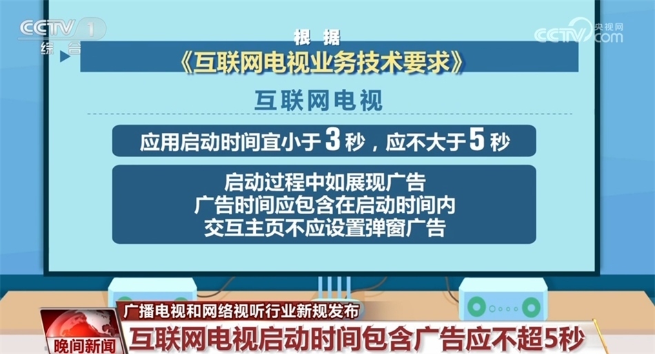 根據(jù)《互聯(lián)網(wǎng)電視業(yè)務(wù)技術(shù)要求》,互聯(lián)網(wǎng)電視應(yīng)用啟動時間宜小于3秒,應(yīng)不大于5秒,啟動過程中如展現(xiàn)廣告,廣告時間應(yīng)包含在啟動時間內(nèi)。交互主頁不應(yīng)設(shè)置彈窗廣告。交互主頁應(yīng)設(shè)置顯著、便捷的免費業(yè)務(wù)專區(qū)入口。在付費提示方面,互聯(lián)網(wǎng)電視對于業(yè)務(wù)的訂購或退訂等相關(guān)操作不應(yīng)設(shè)置“一鍵付費”,對于任何業(yè)務(wù)的定期或連續(xù)扣費,均應(yīng)在扣費前明確、主動提示用戶。