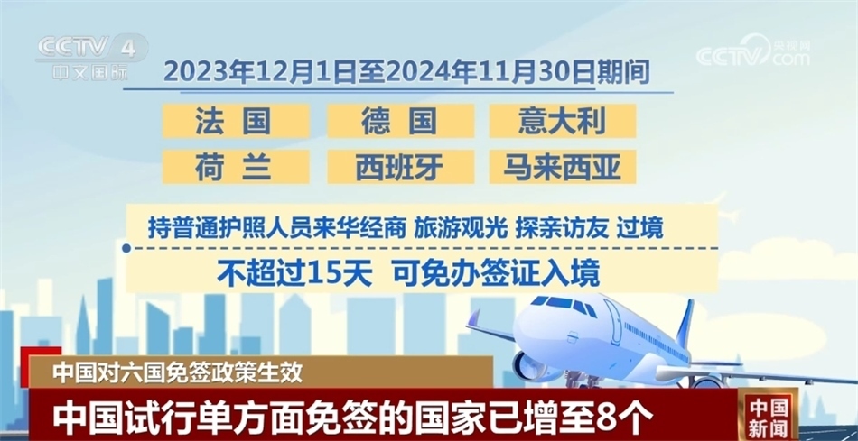 2023年12月1日至2024年11月30日期間,法國、德國、意大利、荷蘭、西班牙、馬來西亞6個國家持普通護照人員來華經(jīng)商、旅游觀光、探親訪友和過境不超過15天,可免辦簽證入境。至此,我國試行單方面免簽的國家從原先2個(文萊、新加坡)增加至8個,覆蓋國家也從亞洲擴大至歐洲。