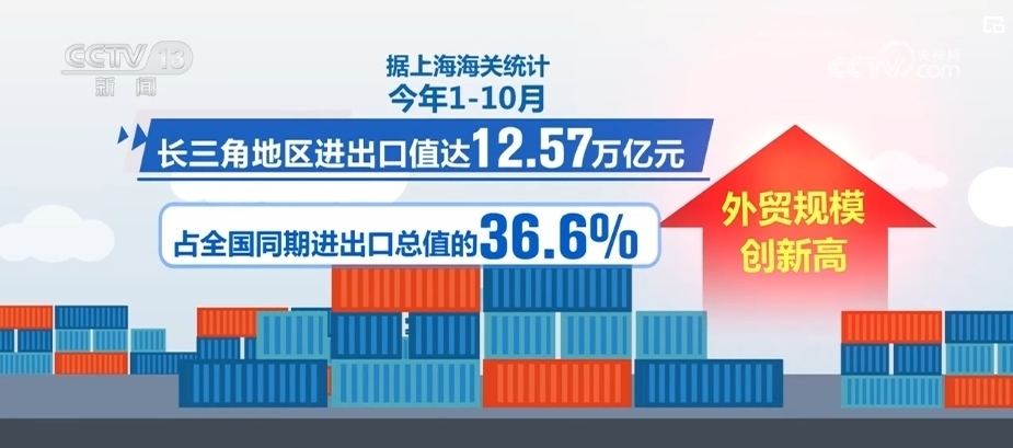 據(jù)上海海關(guān)統(tǒng)計(jì),2023年1—10月,長三角地區(qū)進(jìn)出口值達(dá)12.57萬億元,占全國同期進(jìn)出口總值的36.6%,外貿(mào)規(guī)模創(chuàng)新高。