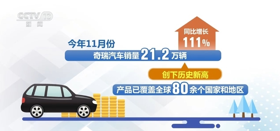 最新數(shù)據(jù)顯示,2023年11月份,奇瑞汽車銷量21.2萬輛,同比增長111%,創(chuàng)下歷史新高,產(chǎn)品已覆蓋全球80余個(gè)國家和地區(qū)。