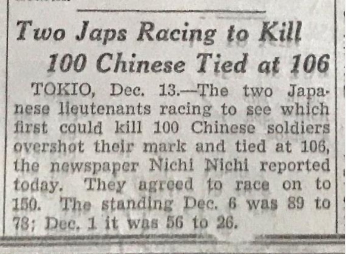 “根據(jù)《東京日日新聞》報道,兩名日本軍官比賽看誰能先殺死100名中國士兵,結(jié)果都?xì)⒘顺^100人,雙方打平殺了106人,他們又同意重新比賽殺到150人為止,12月6日是89比78,12月1日是56比26?!边@是1937年12月14日發(fā)行的《芝加哥每日論壇》中,一篇有關(guān)兩名日本軍官進(jìn)行“百人斬”殺人競賽的報道節(jié)選。