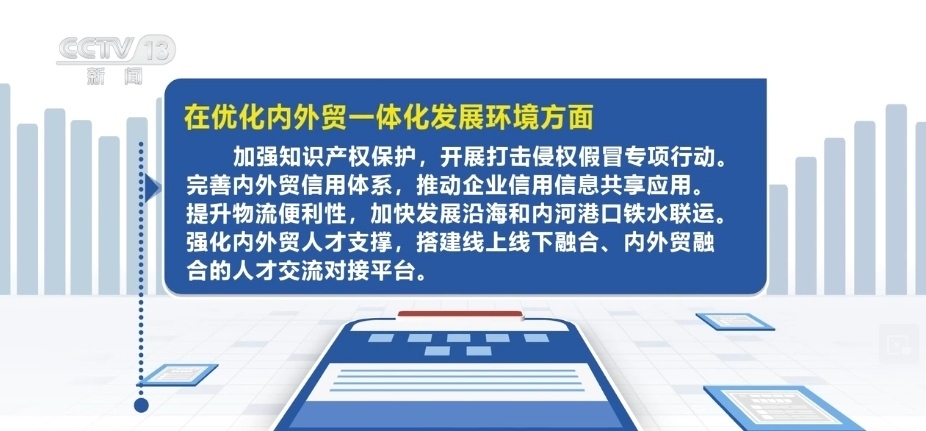 在優(yōu)化內(nèi)外貿(mào)一體化發(fā)展環(huán)境方面,加強知識產(chǎn)權(quán)保護,開展打擊侵權(quán)假冒專項行動。完善內(nèi)外貿(mào)信用體系,推動企業(yè)信用信息共享應(yīng)用。提升物流便利性,加快發(fā)展沿海和內(nèi)河港口鐵水聯(lián)運。強化內(nèi)外貿(mào)人才支撐,搭建線上線下融合、內(nèi)外貿(mào)融合的人才交流對接平臺。