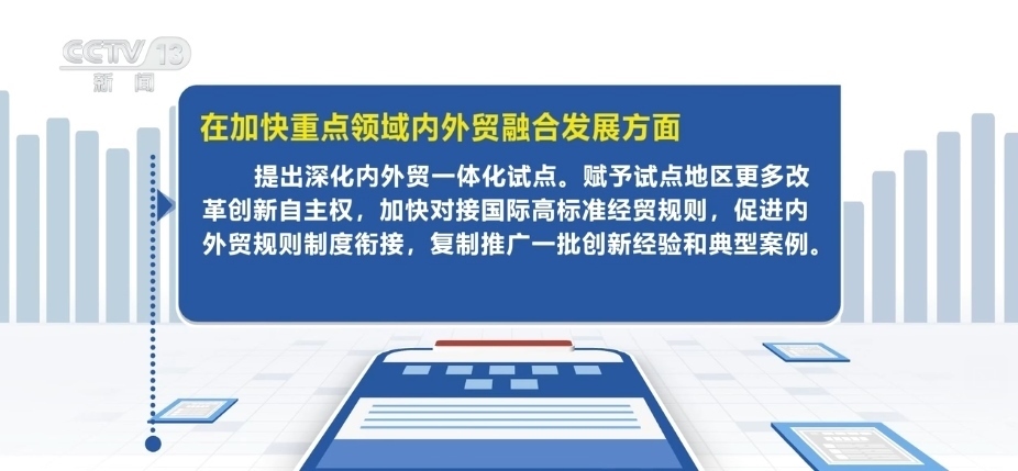 在加快重點領(lǐng)域內(nèi)外貿(mào)融合發(fā)展方面,提出深化內(nèi)外貿(mào)一體化試點。賦予試點地區(qū)更多改革創(chuàng)新自主權(quán),加快對接國際高標(biāo)準(zhǔn)經(jīng)貿(mào)規(guī)則,促進內(nèi)外貿(mào)規(guī)則制度銜接,復(fù)制推廣一批創(chuàng)新經(jīng)驗和典型案例。