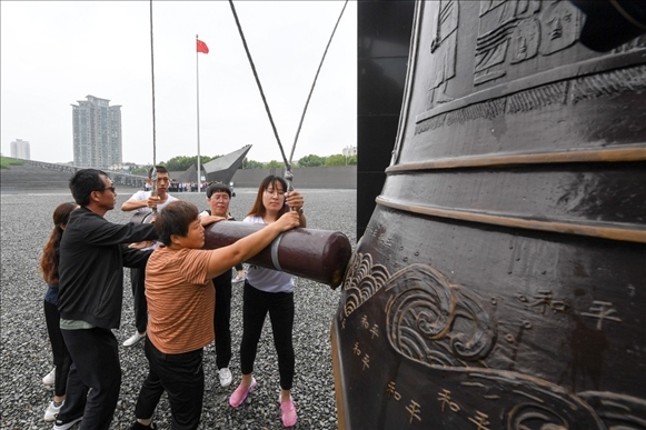 2019年9月3日,人們?cè)谇秩A日軍南京大屠殺遇難同胞紀(jì)念館撞響和平大鐘。 新華社記者李博 攝
